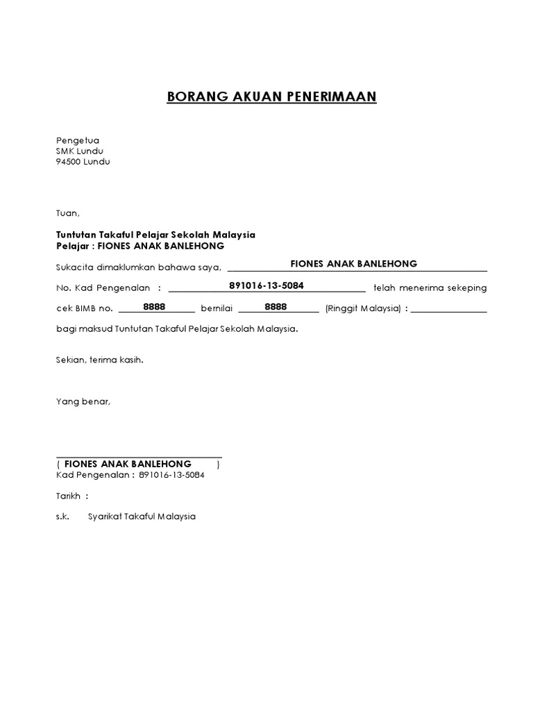 Photocopy of the representatives IC. Contoh Surat Akuan Penerimaan Bayaran K p staf aiamat penerima. Pihak sekolah boleh muat turun borang sebagai rujukan surat iringan borang akuan penerimaan dan pengesahan.