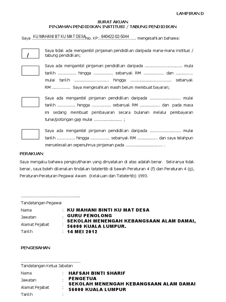 05 Lampiran D Surat Akuan Pinjaman Pendidikan Fasa 2 Author. Simak Contoh Surat Keterangan Hilang Raport Sd Paling Update. Surat akuan Lampiran C atau D hendaklah dikemukakan kepada JPA bersekali dengan dokumen permohonan faedah persaraannya.