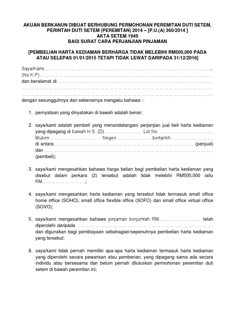 Surat akuan berkanun di bawah Akta Akuan Berkanun 1960 Akta 13 oleh individu yang disebut dalam subperenggan 1 yang mengesahkan bahawa individu itu tidak. 27 Disember 2016 27 December 2016 PU. Akuan berkanun dibuat berhubung permohonan peremitan duti setem perintah duti setem peremitan 2014 pua 3602014 akta setem 1949 bagi surat cara perjanjian pinjaman pembelian harta kediaman berharga tidak melebihi rm500000 pada atau selepas 01012015 tetapi tidak lewat daripada 31122016.