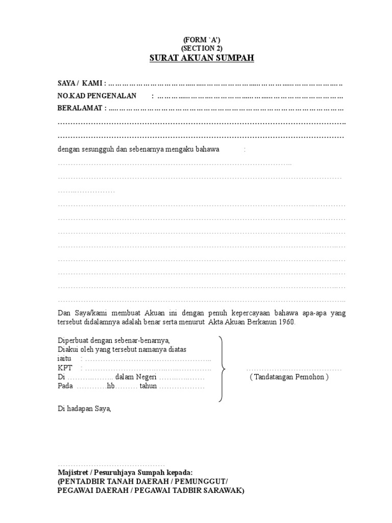 Contoh Surat Akuan Sumpah Berkanun Akta 1960 Contoh Surat. Tersebut di dalamnya adalah benar serta menurut Akta Akuan Berkanun 1960 Diperbuat dan dengan sebenar-benarnya Diakui oleh yang. Surat akuan sumpah ksal doc pdf document.