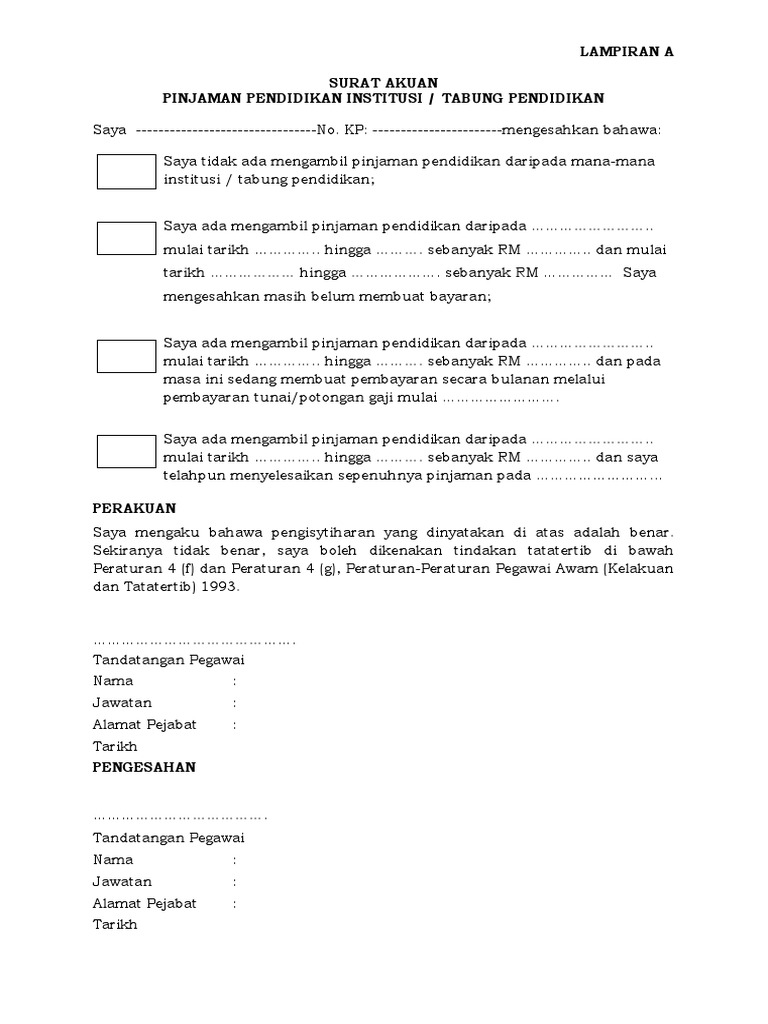 Surat akuan pinjaman pendidikan institusi tabuang pendidikan lampiran c. Lampiran C Lampiran D - Surat Akuan Pinjaman Pendidikan Institusi Tabung Pendidikan Sila penuhkan surat ini walaupun tidak membuat pinjaman 2 muka Surat Tanda Dipetak Saya tidal ada mengambil pinjaman Lampiran F - kenyataan Ketua Jabatan - Contoh Format dilampirkan Lampiran Tl - Butir-butir calon untuk tapisan keutuhan Salinan Kad Pengenalan. Surat Akuan Pinjaman Pendidikan Institusi Atau Tabung Pendidikan Borang PP-1 di Kementerian Kesihatan Malaysia. Mengambil pinjaman pendidikan daripada mana-mana institusitabung pendidikan.